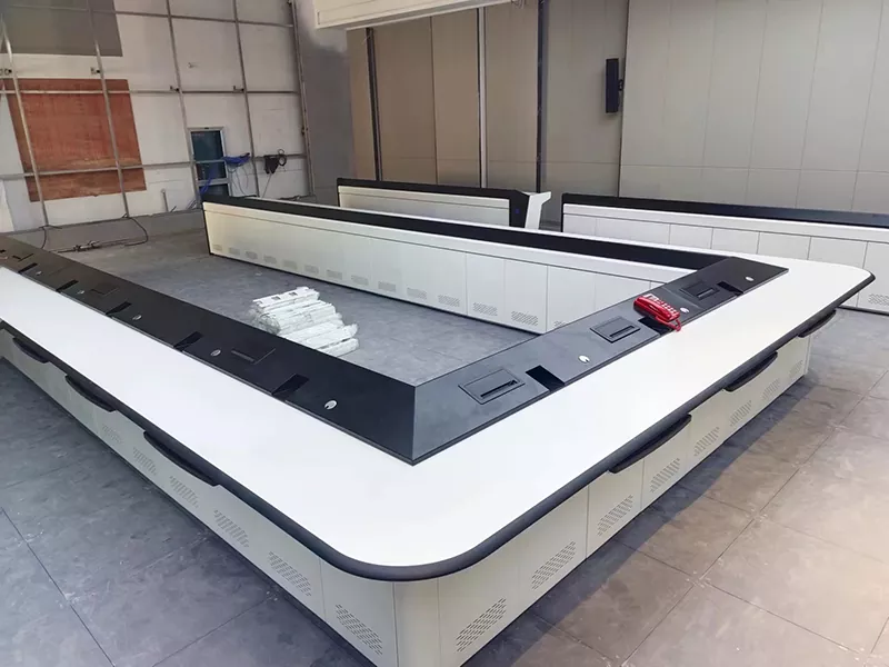 Het product heeft een omhullend U-vormig structuurontwerp, waardoor gecentraliseerde inzet van bewakingsapparatuur, informatieweergave vanuit meerdere hoeken en efficiënte samenwerking mogelijk is. Het wordt op grote schaal gebruikt in commandocentra van de overheid, controlekamers van ondernemingen, stedelijke beveiligingssystemen en energiecentrales.